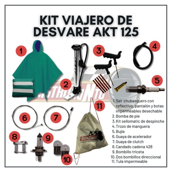 El Kit Viajero de Desvare para AKT 125 es el compañero perfecto para cualquier aventurero en dos ruedas que busca la máxima comodidad y preparación en sus viajes. Diseñado meticulosamente para satisfacer las necesidades específicas de los motociclistas, este kit está repleto de herramientas y accesorios esenciales que te mantendrán en movimiento y seguro en tus travesías por carretera.